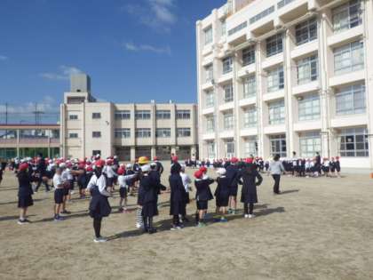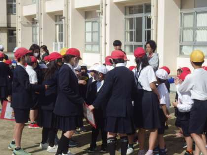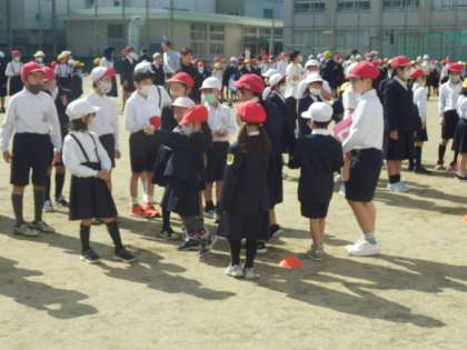 今日の児童集会は、はじめてのたてわり班活動でした。最初に2〜6年生が運動場に集合し、1年生を迎えます。1年生はこのあいだ一緒に交流した6年生に迎えに来てもらって、それぞれの班に入ります。班のみんなが拍手で迎え入れて、たてわり班がスタートしました。