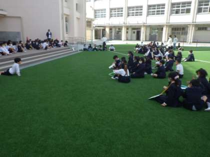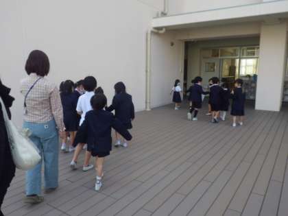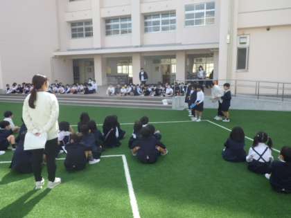 今日は、1・2年生が「学校たんけん」をしました。良い天気で、サブグラウンドで集合して、1・2年生の合同班をつくります。互いに「よろしくおねがいします」とあいさつをして、いよいよ学校たんけんに出発です。