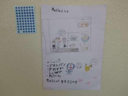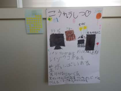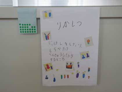 校長室や保健室など、学校の部屋の前には前日までに2年生が準備したポスターがはられています。それぞれの部屋の特徴など、説明が入っているポスターを探して学校たんけんを進めていきます。