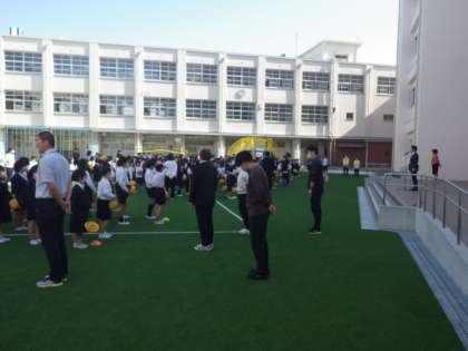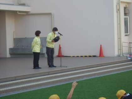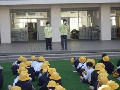 今日の児童朝会で、区役所の安まち隊の方から交通安全のことについてお話がありました。安全な道路の歩行に気を付けてほしいこと、自転車に乗る時に、安全のためにヘルメットの着用が推奨されていることのお話でした。
