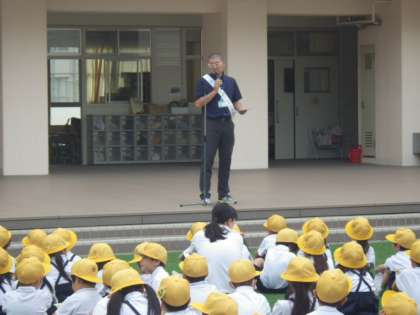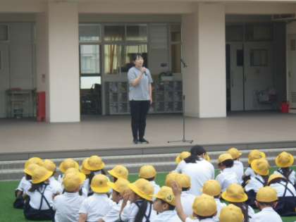 次に監護当番の先生から雨の日の過ごし方についてお話がありました。梅雨の時期は湿度が高く、廊下や階段が湿って滑りやすくなります。安全な歩行を心がけてほしいとのお話でした。