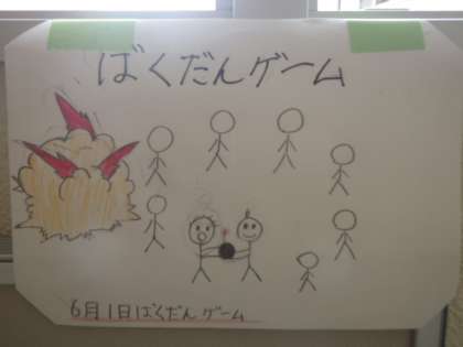 今日の集会は「ばくだんゲーム」でした。たてわり班で輪になって、音楽がかかっている間ドッジボールを順番に回していきます。集会委員会の人が「ドン」という時にボールを持っていた人が輪の真ん中に入って一回休みになります。