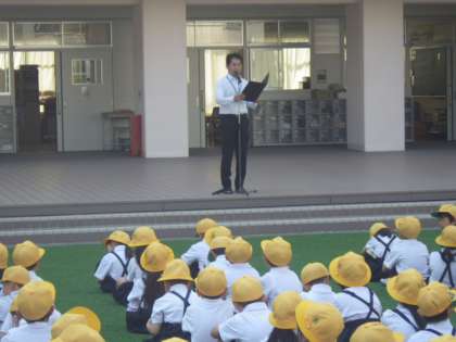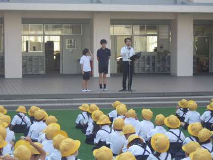 今日の児童朝会は、今日からしばらくの間、本校に体験入学するお友達の紹介から始まりました。校長先生から紹介があって、みんなで拍手で迎えました。しばらくの間ですが、きっと良い思い出ができると思います。