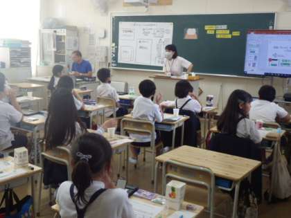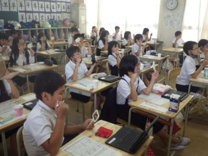 (4)はキシリトールの咀嚼(そしゃく)チェックガムを使って、1分間にどれだけ嚙めるかを調べました。みなさんピンク色になるまで嚙めましたね。