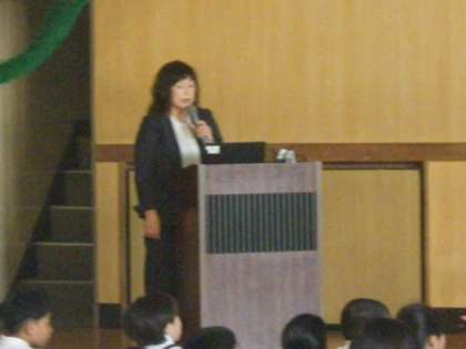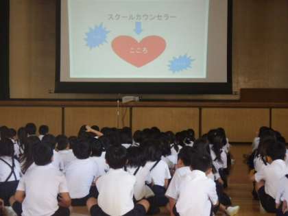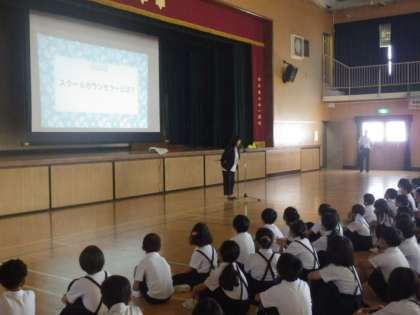 今日の児童朝会はスクールカウンセラーさんのお話から始まりました。学校にはスクールカウンセラーという専門の先生がいて、みんなの心の健康を見守っていただいています。