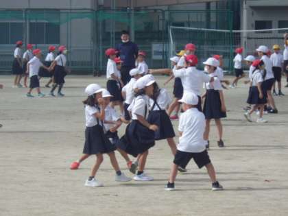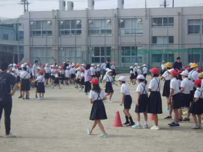 今日はたてわり班で「じゃんけんドン」をしました。それぞれ、赤と青、黄と緑のたてわり班で向かい合って、走ります。出会ったところでじゃんけんをして、勝ったら進みます。負けた側は、走って自分の列に戻って、後ろに並びます。