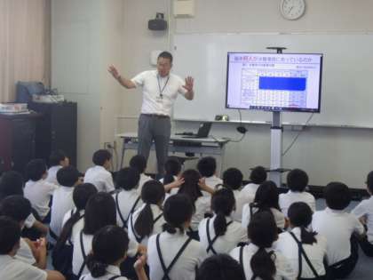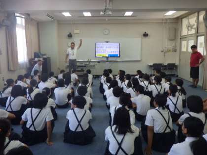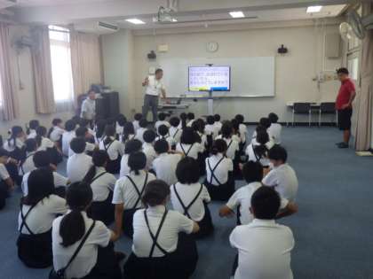 今日は副校長先生の着衣泳の学習がありました。始めに事前学習を行いました。毎年少なくない人数の水難事故があることや、実際に目の前でおぼれている人に遭遇した時にはどうするかを考えました。