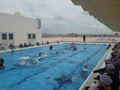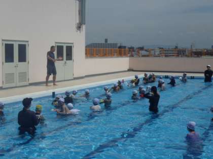 次はプールに入って、実際に浮かんだり泳いだりします。水中では歩くだけでも一苦労です。力を抜いて浮かぶこと、何か浮きになるものを上手に活用することができるように工夫することなど、実際に水に入って体験します。
