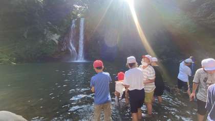 その後、宿舎前でスイカを頂きました。滝で冷やした冷たくて甘いスイカを食べて、普段は出来ない種飛ばし選手権もしました!
