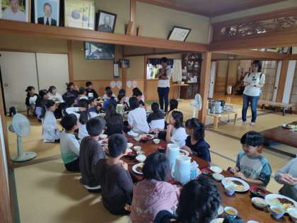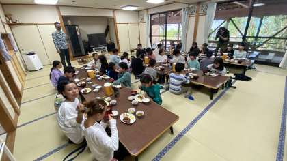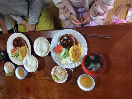 今日のメニューはハンバーグ!とても美味しくて、なんと!ご飯を4杯おかわりした子もいました。いっぱい動いて汗をかいた分、いっぱい食べました!