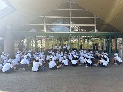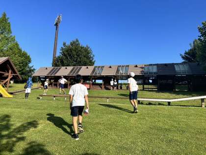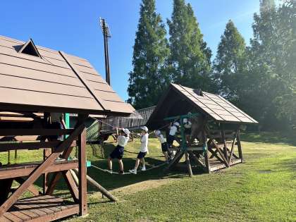 おはようございます。林間学校3日目が始まりました。今日最初の活動は、但馬ドームの広場で1、2組合同の朝の集いです。ラジオ体操をした後、みんなで「こじん」という鬼ごっこをしました。起きてからすぐの活動でしたが、みんな元気に走りまわっていました。そして、広場に併設されたアスレチックでも遊び、朝からお腹ペコペコです。