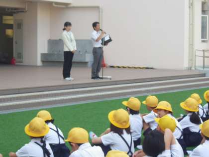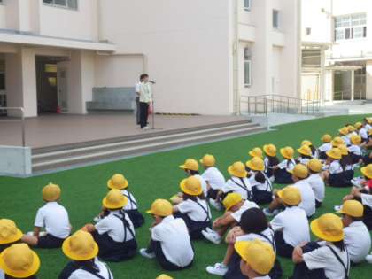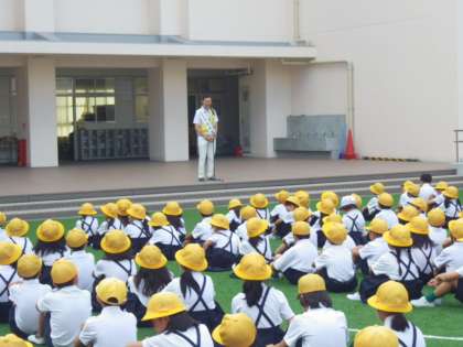 最初に、生野区長様から、夏休み中に田島南小学校の人が、困っている人の手助けをして大変思いやりのある働きで、素晴らしかったことについてお知らせとお礼のお話をいただきました。