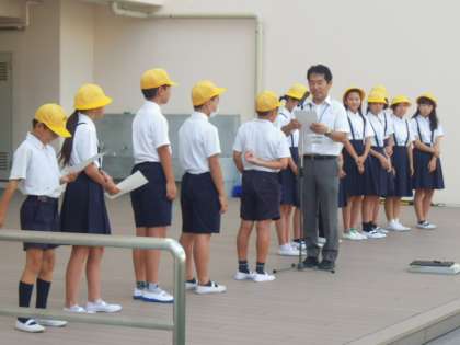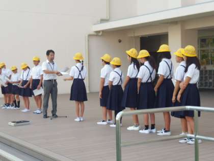 まず8月3日(木)の大阪市児童泳力記録会に参加した皆さんの記録証の伝達です。それぞれの記録を校長先生が読み上げてくださいました。