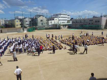 今日は大阪880万人訓練の放送に合わせて、小中合同の避難訓練を行いました。今日の訓練は、地震と津波、洪水を想定しての実施です。大阪府下で出される緊急メール速報や同報無全放送を絡めての訓練になりました。