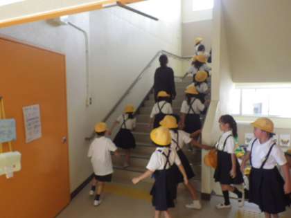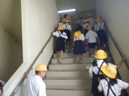 午後1時30分の緊急地震速報とともに訓練開始です。1次避難で運動場へ出ます。次に建物3階以上への避難です。
