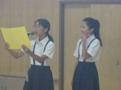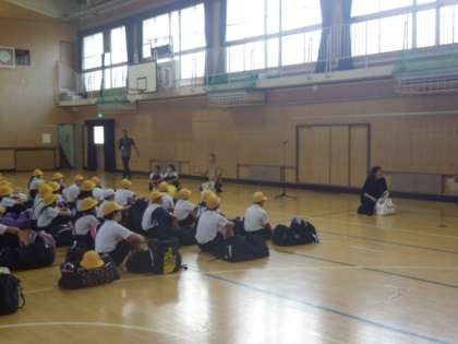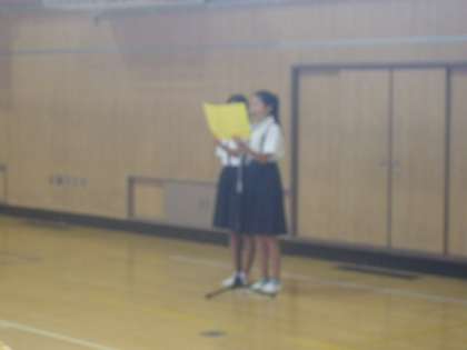 今日から2日間6年生は白浜方面に修学旅行に行きます。体育館に集合して出発式を行いました。司会の人の進行で、進めます。