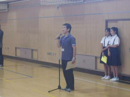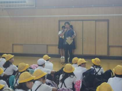 校長先生からのお話です。修学旅行のめあて「自分と自分以外のみんなが楽しめるようにする。」「自分で考え、判断し、正しい行動をとれるようにする。」を確かめて、修学旅行が有意義な時間になるようにしましょうとお話しいただきました。