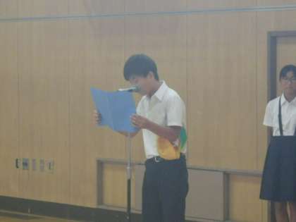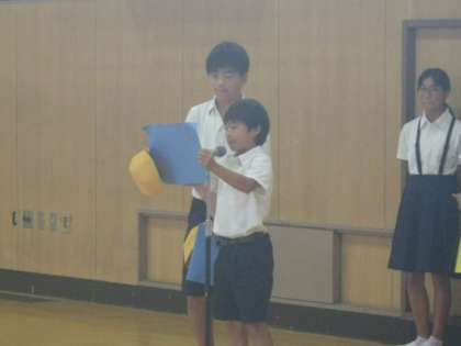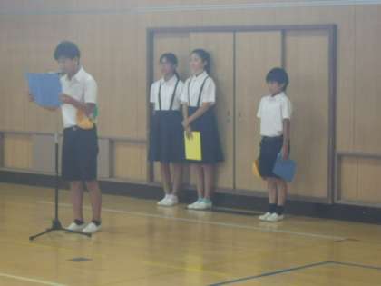 次に児童代表の言葉です。修学旅行で楽しみにしていること、行くまでのわくわくを素直に表して、自然と拍手が起こる言葉でした。きびきびした気持ちのいいあいさつで言葉を締めくくりました。