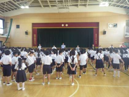 月曜日の朝は小学生がみんな集まっての児童朝会をしています。今日は副校長先生からのお話です。