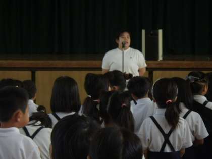 次は監護当番の先生から今月の生活目標についてお話がありました。今月の生活目標は「安全に生活しよう」です。