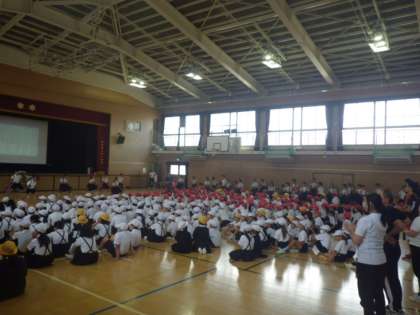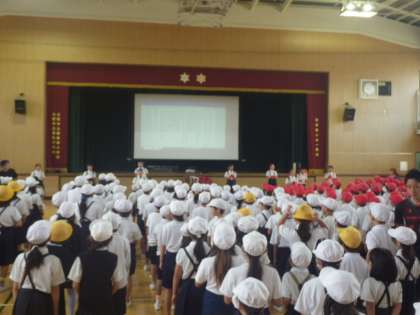 今日の児童集会は、体育館で応援集会です。運動会の応援合戦に向けての練習です。今日は一拍子、二拍子、三三七拍子の手拍子や掛け声の練習です。始めはテンポがつかみにくい場面もありましたが、練習していくと応援の声に熱がこもって、体育館全体にひびく声になりました。