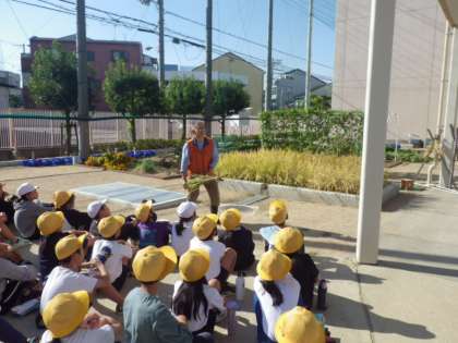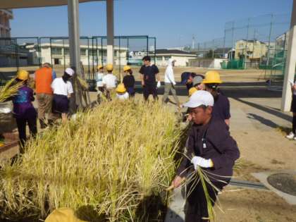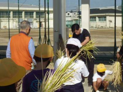 学校の水田で田植えをして、お世話していた稲が育ち、いよいよ稲刈りの季節になりました。田んぼのことではいつもお世話になっている塩川さんのご指導の下、実際にカマを使って稲を切っていきます。