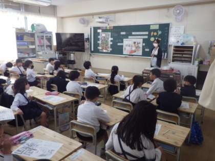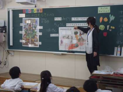 1年生の栄養指導は野菜の栄養や食べ方について学ぶ「やさいだいすき」でした。野菜には葉物野菜や根菜、果菜類といった食べるところでの違いやそれぞれの栄養がヒトが活動する上でとても大事なものであることを教えていただきました。