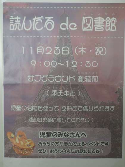 今日のお昼の図書の放送は、11月23日(木・祝)にある学習発表会のときに開設される出張図書館『読んだる de 図書館』(フランス語風)のお知らせでした。