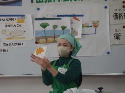 次に大地の会の方から、れんこんの栄養や調理の仕方について教えていただきました。同じ大きさのミカンとれんこんでは、れんこんの方がビタミンCを豊富に含んでいることも初めて知って驚いていました。