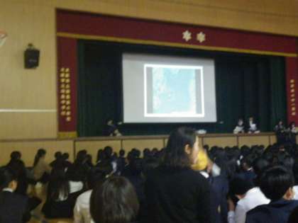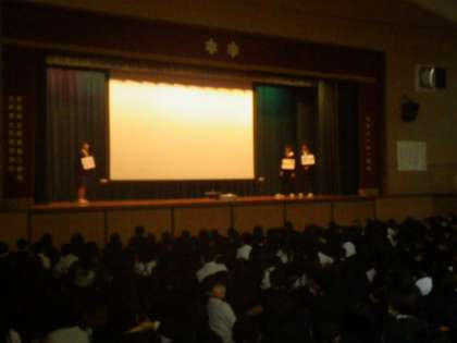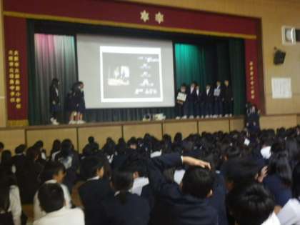 中学校の安全健康委員会の皆さんは劇「歯のきれいな桃太郎」をユーモアたっぷりに発表してくれました。桃太郎登場から小学生は大盛り上がりで、前に立っている委員会の皆さんが、次の言葉を出すタイミングがつかめないくらいでした。