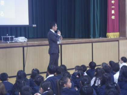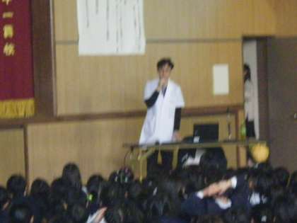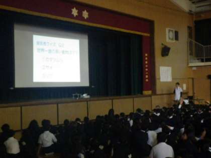 次に中学校の歯科校医先生からお話がありました。歯と口の健康に関する詳しいお話で、歯のモース硬度は鉄より硬い7だといううことであったり、レントゲン写真で乳歯と永久歯がどのように生えているのかがわかったり、むし歯を進行させないためには歯磨きが大事であることなどを教えていただきました。