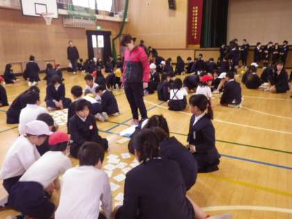 集会委員会が司会で、読み札を読んでいきます。みんなで一斉にどこかなぁと絵札を探します。「ハイ!」という声ととともに札を押さえてにっこり。「あーおてつきやった」という声や、「あっこにあるで」と下の学年の子に札を教えてとれるようにしている高学年の姿もありました。
