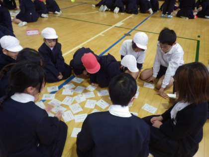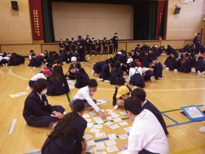 今日の児童集会はたてわり班でかるたをしました。みんなで輪になって絵札を並べて用意をします。昨年から集会委員会で準備をして、たくさんの絵札をそろえてくれました。