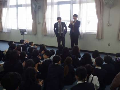 それぞれ事前にコンビを作って、ネタの打ち合わせもしています。今日は昨年度もお世話になった「チャイルドプリンス」のお二人に来ていただき、漫才を発表するための練習にアドバイスをしていただきました。また、発表の司会や感想をいただいて、みんな大盛り上がりでした。こうした経験を通して、自分から表現する楽しさや、発表の受け止め方、見ている人の反応を感じることなど非認知能力を養うことができるのだと感じました。