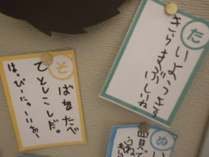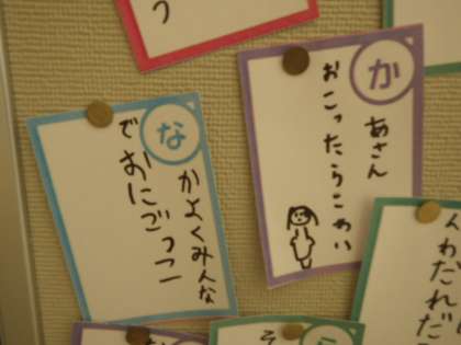 職員室の前の掲示板で、「カルタをつくろう}」と題して、カルタをモチーフにして「あいうえお作文」に取り組んでいます。
