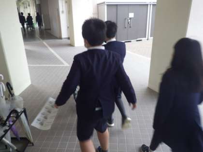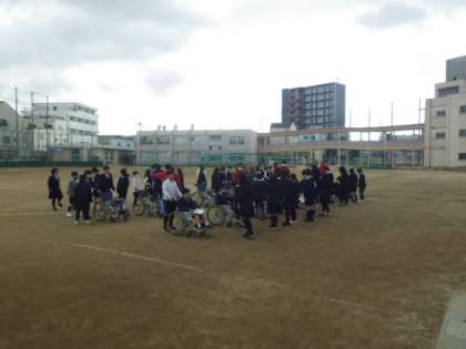 運動場をスタートにして、校舎1階をぐるりと回るコースです。スロープは後ろを向いて降りる。曲がったり止まったり、動きだしたりするときには声をかける。教えていただいたことを実際に使ってコースを回っていきます。