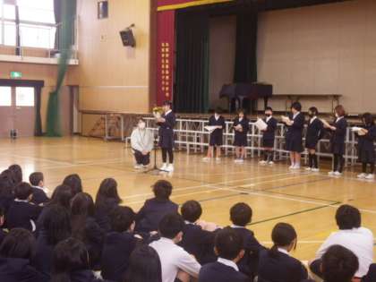 今日は図書の取り組みで「本の帯コンクール」の最優秀賞の人の表彰がありました。それぞれ工夫した本の帯は、以前のHPに掲載していますので、ご覧ください。みんなから暖かい拍手をもらいました。