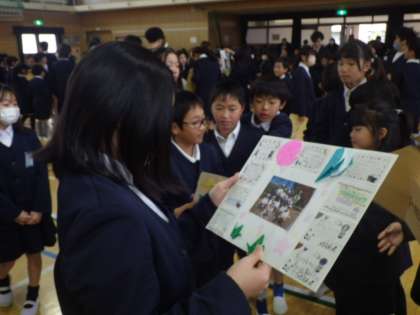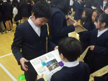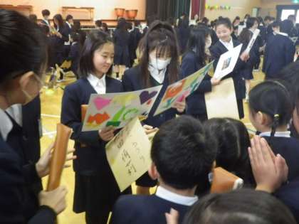 司会の先生の合図で、班のみんなから色紙のプレゼントを渡しました。6年生が、じっとメッセージを見つめる様子が見られました。これまでの思い出と卒業という実感をかみしめているのかもしれませんね。