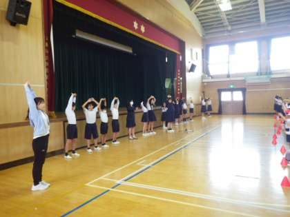 次は姿勢体操です。音楽に合わせて体を伸ばしたりひねったりします。短い時間のストレッチですが、しっかりと体を動かすと、朝からすっきりとした気持ちになれますね。