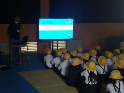 格技室では、動画でごみの収集や焼却工場について教えてもらいました。