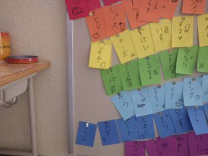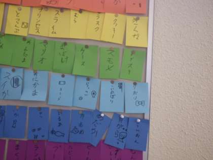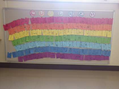 以前半分まで埋まっていた「にじのしりとり」が掲示板いっぱいになりました。たくさんの言葉を集めてくれたみんな、ありがとう!