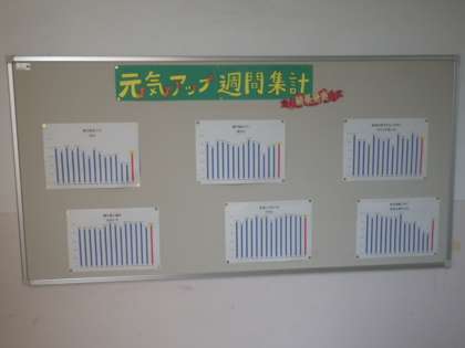 3号館の掲示板に元気アップ週間の結果を掲示しています。毎日の校内生活での過ごし方や、生活習慣についてふりかえるようになっています。