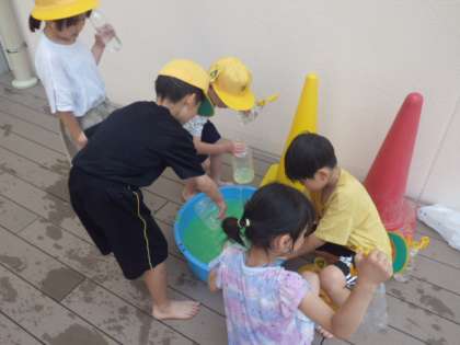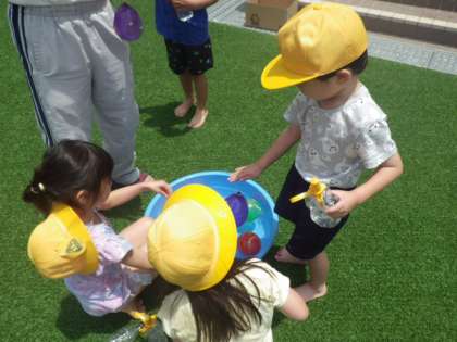 2組の活動の様子です。みんな水がかかってぬれていますが、気持ちいいようで、水を掛け合ったり、自分でかぶったり、たらいに入ったり、それぞれに水との触れ合いを楽しんでいました。