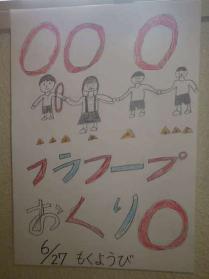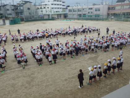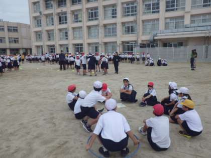 今日の児童集会は「フラフープおくり」でした。たてわり班で手をつないで輪になり、フラフープを手を放さずに一周させる速さを競います。