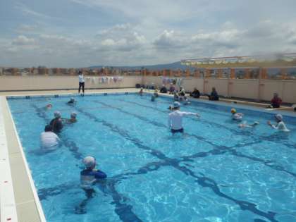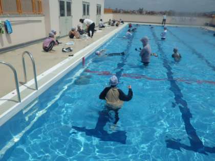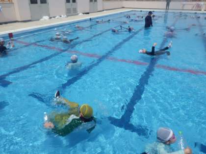 服のまま水にはいる経験自体なかなかないものですので、始めは子ども達もおっかなびっくりでしたが、着衣のまま水に入ることで、水の抵抗やぬれた衣服の重さを実感して、静かに水に浮くことの大切さを学びました。