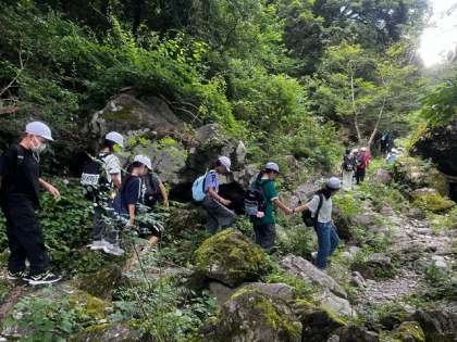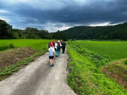 散策コースを歩いています。近くで雷雲が立ち込めており、雨が降るか心配です。