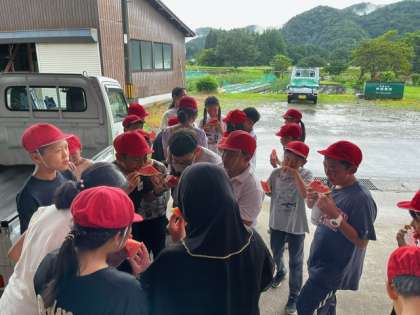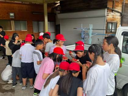 みんなでスイカタイムです!「甘くて美味しい」、「食べたことなかったけど美味しい」と絶賛です!