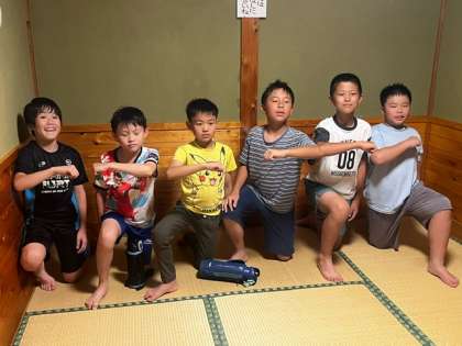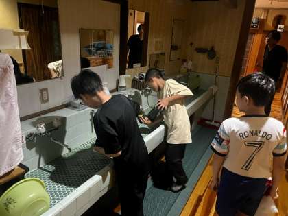 入浴と明日の荷づくりを猛スピードで頑張っています。そのあいだに、部屋のみんなで、はいポーズ!