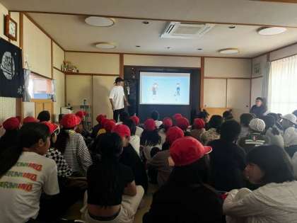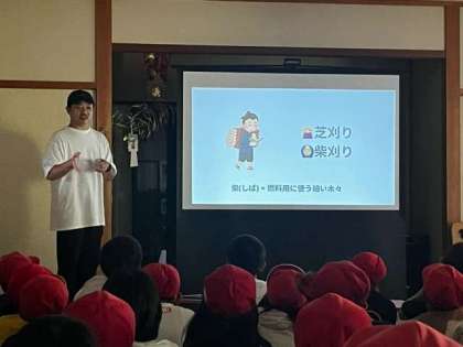 前に、SDGsの取組についてお話を聴いています。宿泊している宿では、薪ストーブを使うことで、気候変動について対策をとっています。