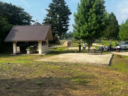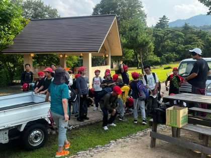飯盒炊さんの場所に到着しました!これから薪割りを始めます。